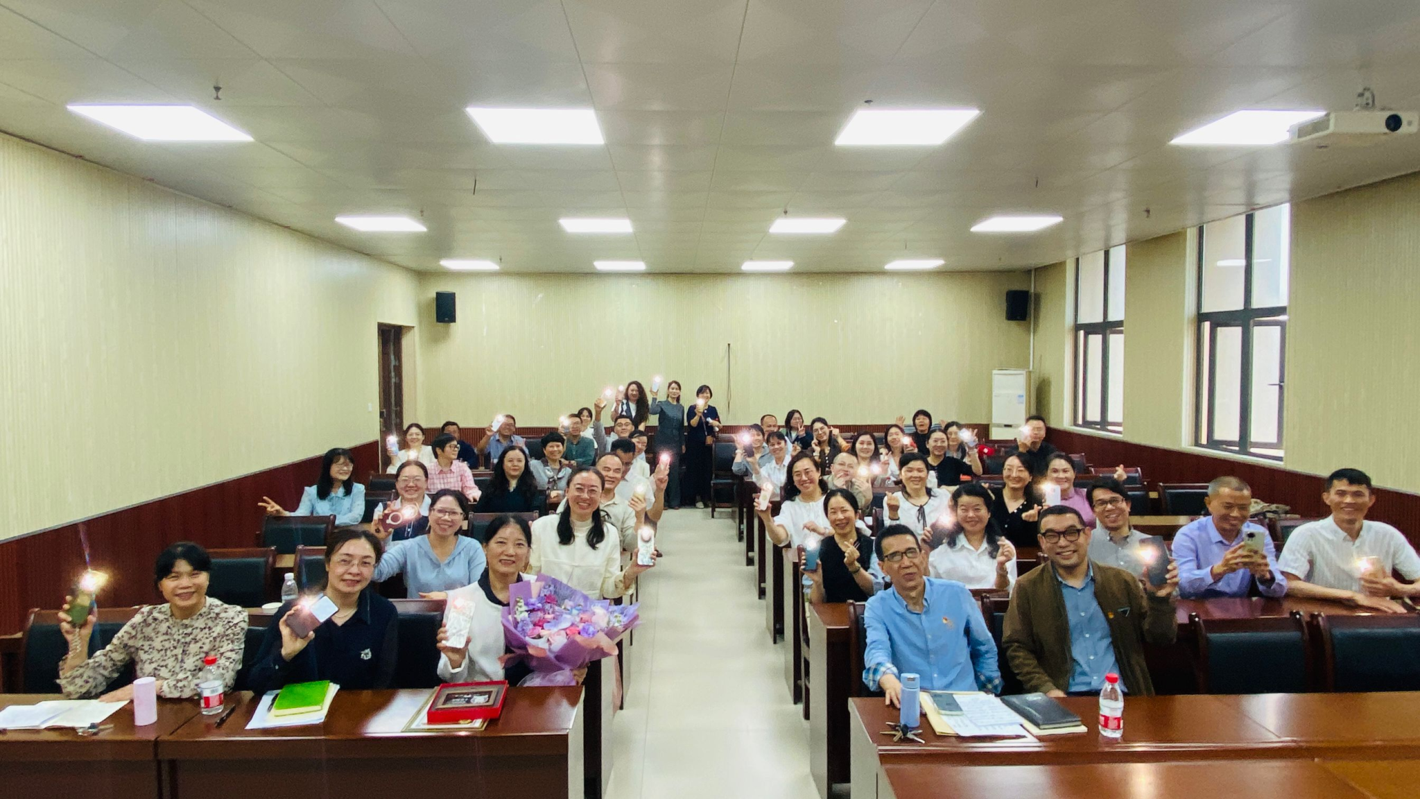 莫道桑榆晚,为霞尚满天。仪式的最后,青年教师代表李美旋老师和韦宵爱老师为黄海燕老师送上鲜花和祝福,在鲜花与掌声中,参会老师们纷纷争相与黄进行合影留念,将这一刻温馨和谐的美好永远定格。