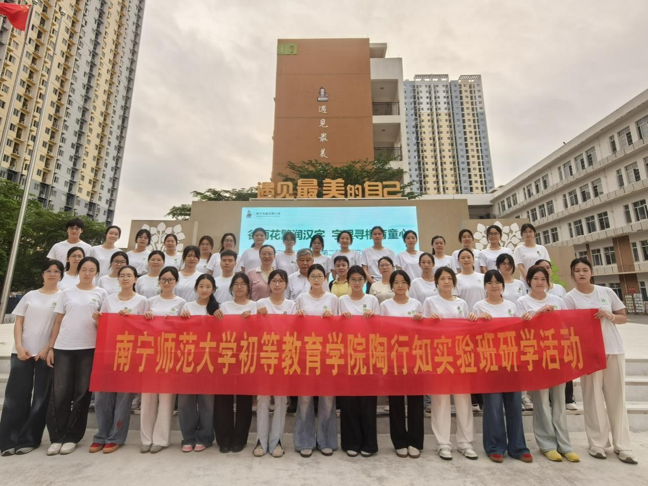 2023级、2024级陶行知实验班及19名研究生学子,在李丹、刘冬梅、韦宵爱、刘飖老师带领下,走进南宁市盘古路小学,参与第二届“谷雨花繁润汉字 字理寻根育童心”谷雨汉字文化节研学活动。