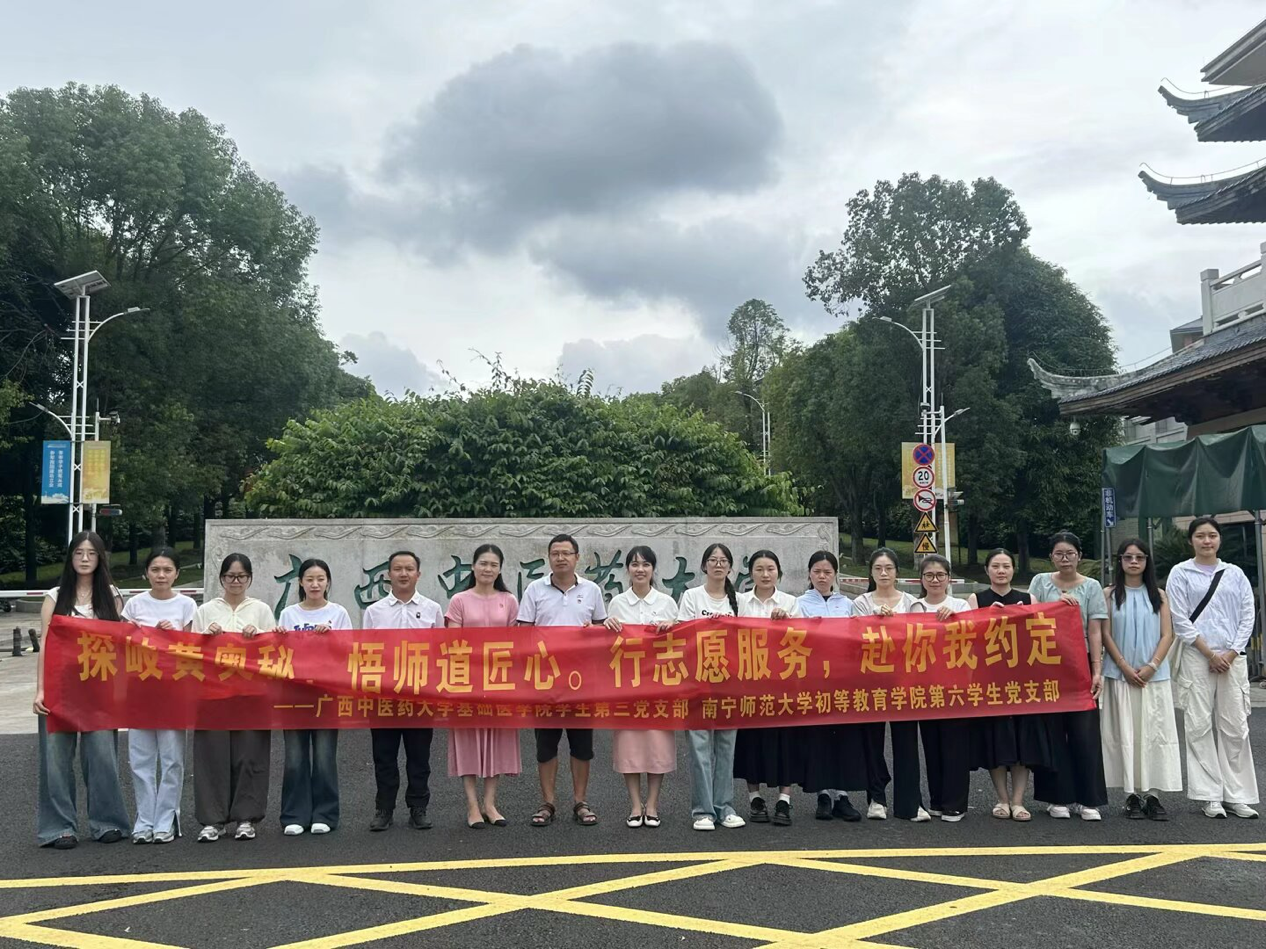 第六学生党支部在支部书记覃诗雅的组织带领下,全体党员前往广西中医药大学,与广西中医药大学基础医学院学生第三党支部开展以“探岐黄奥秘,悟师道匠心·行志愿服务,赴你我约定”为主题的党建交流活动。学院党委群工委员、辅导员谢廷建和辅导员覃素芳参与此次活动。