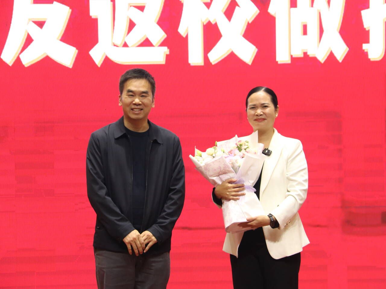 副院长梁秀清为杨琴校友颁发证书并献花、赠送纪念礼品,师生代表共同合影留念。