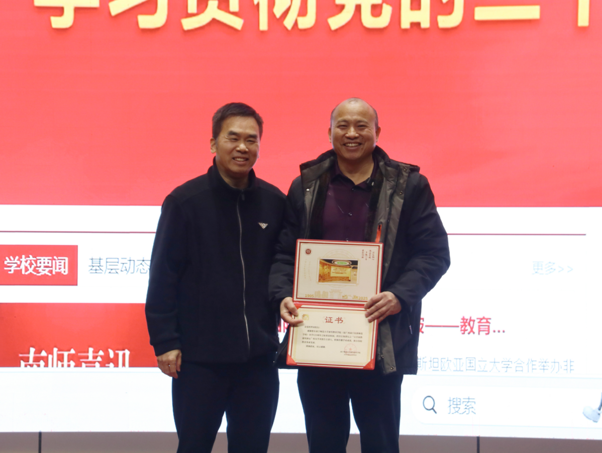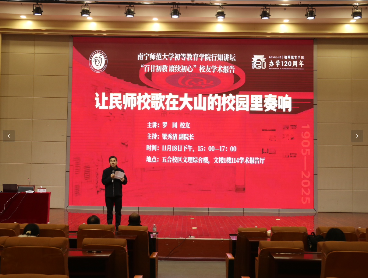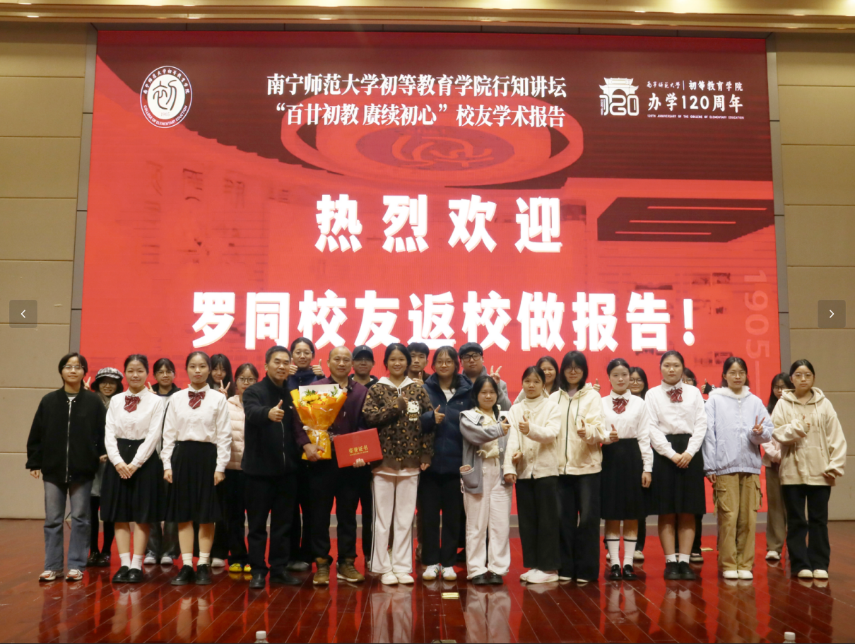 报告以《让民师校歌在大山的校园里奏响》为主题,罗同校友围绕“35年乡村教育坚守”展开分享。他回忆了在校期间学习三笔字、简笔画等技能的求学经历,讲述了毕业后在山区学校身兼数科教学、工作任务繁重、适应乡村教育环境的实践历程;分享了放弃公务员招考、父亲病危时仍坚守课堂的抉择,以及带领师生自建冲凉房、维修校园设施、牵头组织骨干教师巡课、开展市区级课题研究的集体奋斗故事;还介绍了通过教研巡课、课题研究提升教学质量,带领学校斩获学期总评一等奖的办学成果。罗同校友最后以“传承南宁民师精神”的愿景作结,呼吁在场师范生传承“学为人师,行为世范”师道精神,让教育的火种在大山里延续。报告结束后,梁秀清副院长为罗同校友颁发证书并献花,师生代表与校友合影留念。